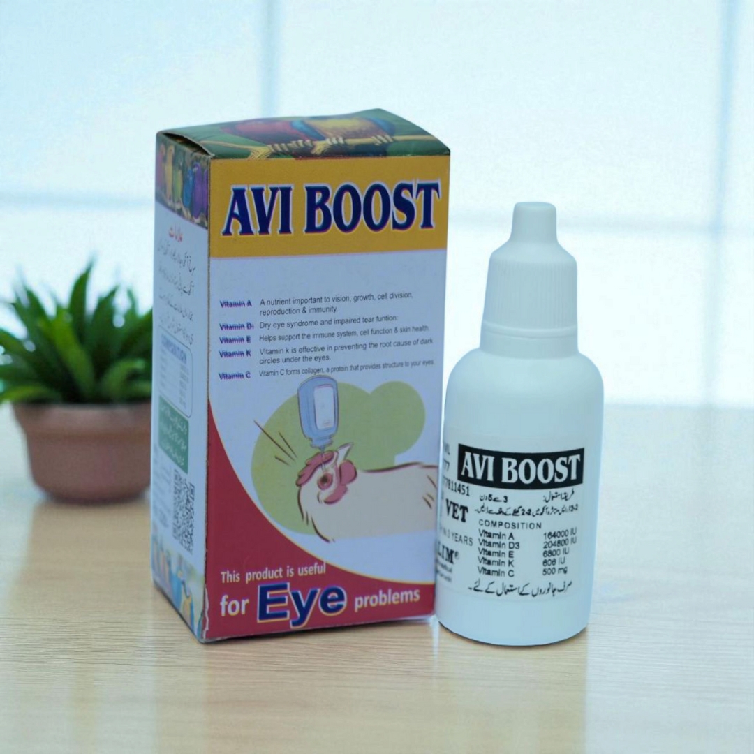 AVI BOOST Eye Drops treat early-stage red eye infections in birds, alleviating swelling, redness, discharge, excessive blinking, and closed eyes for optimal eye health.
