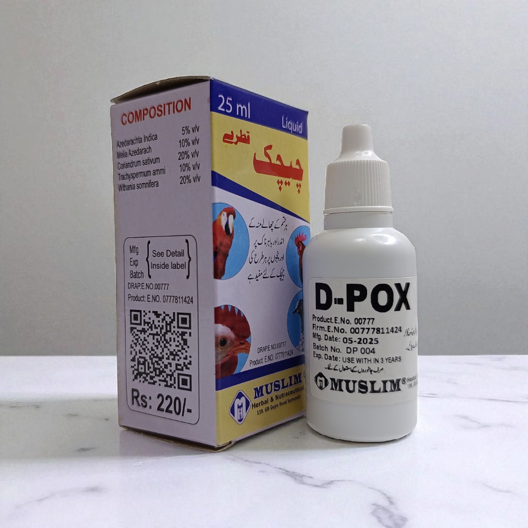D POX prevents and treats dermal and diphtheritic pox in fowls, alleviating skin eruptions, inflammation, and viral infections while promoting respiratory health and overall recovery.