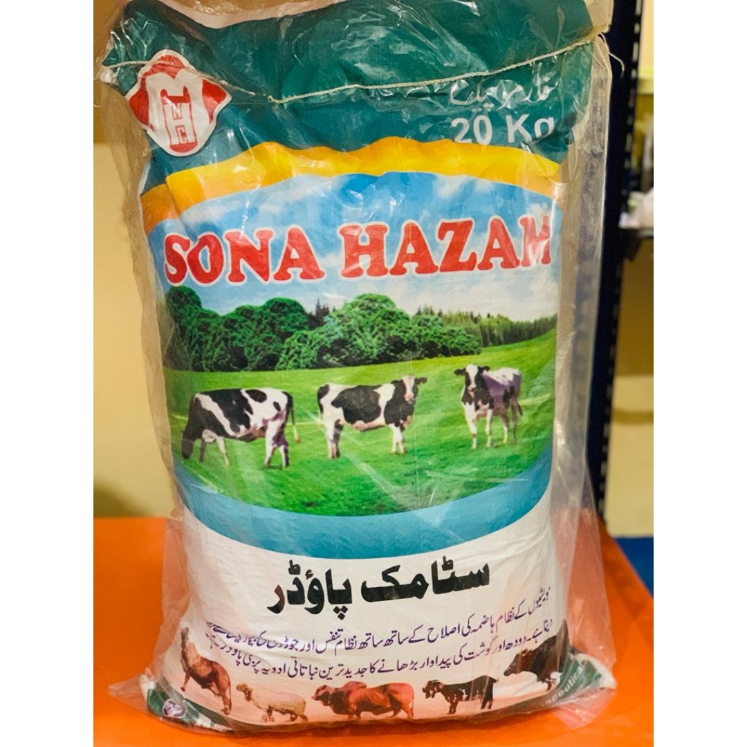 Sona Hazam is a potent supplement that enhances digestion and feed absorption in animals, boosting milk and meat production. It supports body weight gain, growth, productivity, and efficiency while stabilizing digestive processes for improved overall health.